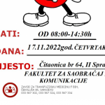 Akcija dobrovoljnog darivanja krvi u prostorijama Fakulteta, 17.11., u periodu od 8-14:30h.